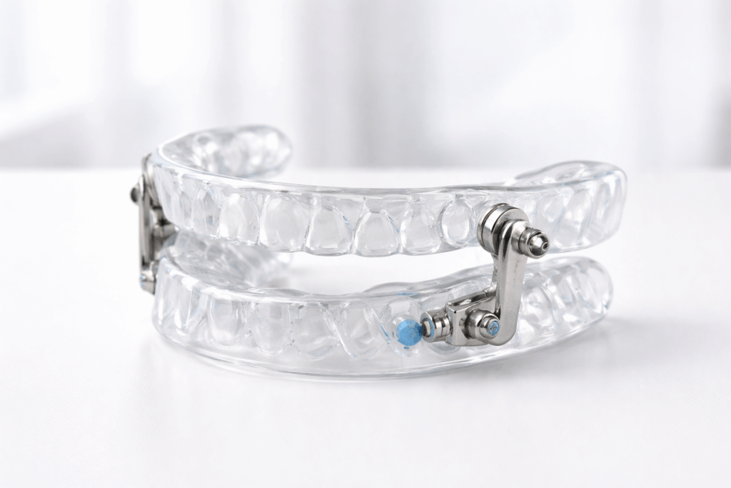 La férula para apnea del sueño es un dispositivo que se coloca sobre los dientes y mantiene la mandíbula ligeramente adelantada. Esta posición evita que la lengua y tejidos blandos bloqueen las vías respiratorias durante la noche.